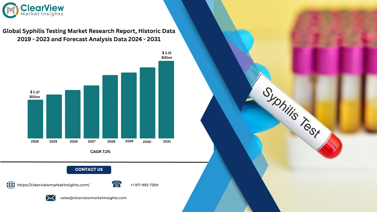 [Geneva, 19 August 2025] – According to Clearview Market Insights (CVMI), the global syphilis testing market is forecasted to grow from USD 1.37 billion in 2024 to USD 2.21 billion by 2031, expanding at a CAGR of 7.1%. Rising adoption of dual HIV/syphilis rapid tests and the expansion of decentralized diagnostic services are fueling this growth, particularly in maternal care and low-resource regions.