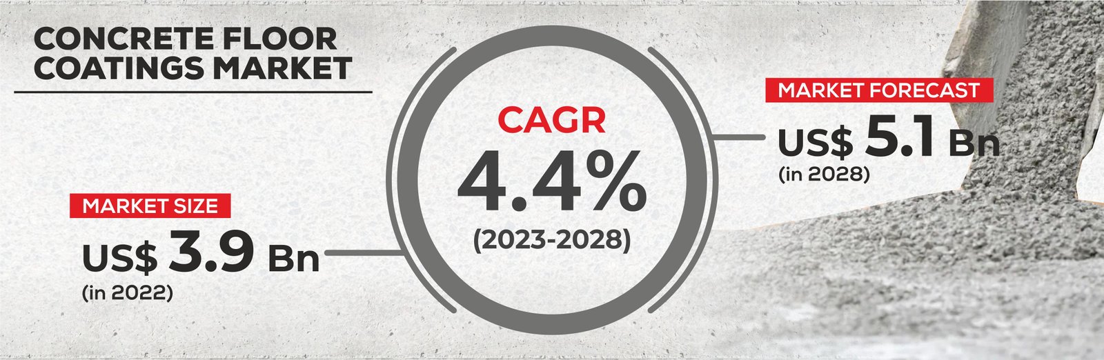 Concrete floor coatings protect slabs from abrasion, chemicals, and traffic while elevating aesthetics—across industrial, commercial, and residential spaces. Stratview Research sizes the concrete floor coatings market at US$3.9 billion (2022) and projects US$5.1 billion by 2028 at a 4.4% CAGR (2023–2028).