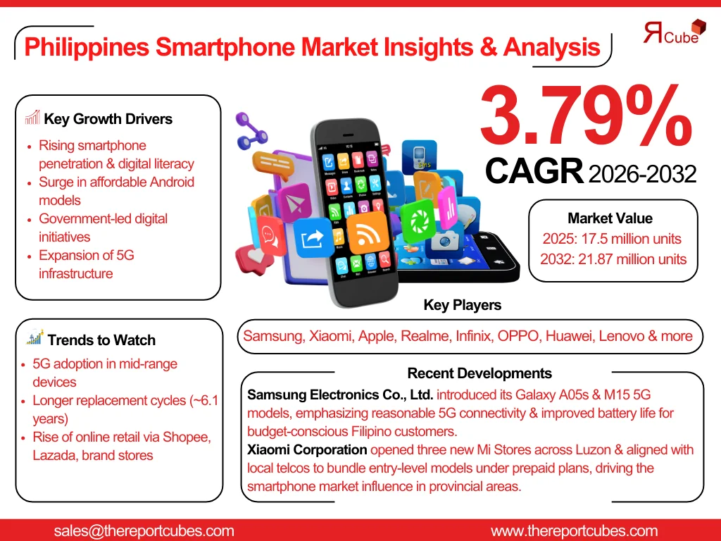 The Report Cube which is one of the leading market research company in UAE expects the Philippines Smartphone Market to grow at a CAGR of around 3.79% through 2032, as highlighted in their latest research report. The study provides an in-depth analysis of the emerging trends shaping the Philippines Smartphone Market and offers detailed forecasts for its potential growth during 2026–2032. The report also presents a comprehensive assessment of the competitive landscape, including profiles of leading players, their performance metrics, and recent strategic developments. Additionally, it explores the key market drivers, challenges, opportunities, and provides insights into historical and future revenue trends at the global, regional, and country levels.