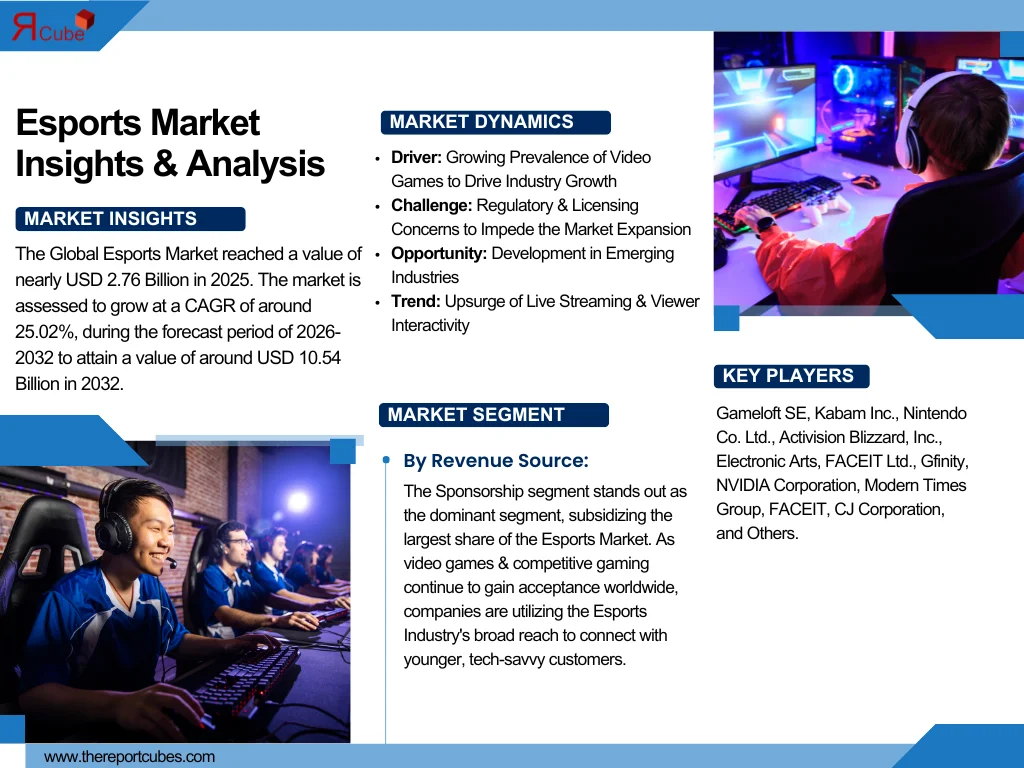 The Report Cube which is one of the leading market research company in UAE expects the Esports Market to grow at a CAGR of around 25.02% through 2032, as highlighted in their latest research report. The study provides an in-depth analysis of the emerging trends shaping the Esports Market and offers detailed forecasts for its potential growth during 2026–2032. The report also presents a comprehensive assessment of the competitive landscape, including profiles of leading players, their performance metrics, and recent strategic developments. Additionally, it explores the key market drivers, challenges, opportunities, and provides insights into historical and future revenue trends at the global, regional, and country levels.