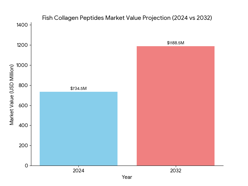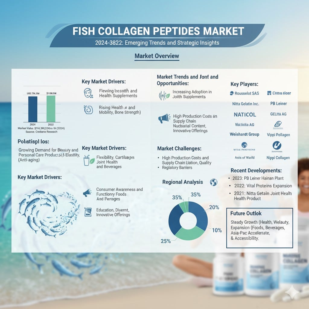 The Fish Collagen Peptides Market was valued at USD 734.5 million in 2024 and is projected to reach USD 1188.5 million by 2032, growing steadily due to rising health and wellness awareness. As per Credence Research, the market benefits from increasing consumer demand for natural, sustainable collagen sources, particularly in beauty, personal care, nutraceutical, and pharmaceutical sectors. Fish collagen peptides enhance skin elasticity, reduce wrinkles, and support joint health, making them highly preferred over bovine and porcine alternatives. The Asia-Pacific region and North America are driving growth, fueled by rising disposable income, health consciousness, and expanding product adoption in dietary supplements and skincare.