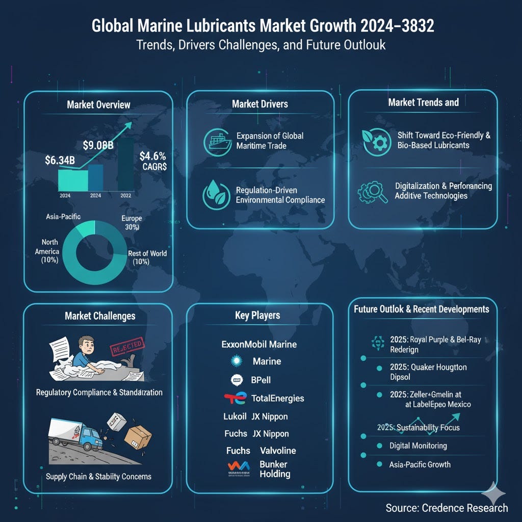 According to Credence Research, the marine lubricants market stood at approximately USD 6.34 billion in 2024 and will rise toward USD 9.08 billion by 2032 with a compound annual growth rate of about 4.6%. Demand grows due to increasing global shipping activity, expanding trade routes, and stricter environmental regulations such as IMO 2020, which push uptake of eco-friendly and low-sulfur lubricant formulations. Advances in additive technologies enhance performance under extreme marine conditions, and operators emphasize operational efficiency to reduce downtime, lower costs, and extend engine life. Asia-Pacific dominates the market share, followed by Europe and North America.
