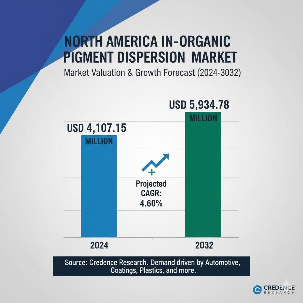 The North America In-Organic Pigment Dispersion Market was valued at USD 4,107.15 million in 2024 and exhibits a projected CAGR of 4.60%, with forecasts reaching USD 5,934.78 million by 2032, as per Credence Research. Demand from automotive, construction, packaging, and printing inks supports steady growth because dispersions deliver color stability, weather resistance, and process efficiency. Regulatory pressure pushes suppliers toward non-toxic, low-VOC formulations and eco-certified products, while technological advances in milling and digital color matching raise product performance. The United States leads regional consumption, supported by strong manufacturing and infrastructure activity.