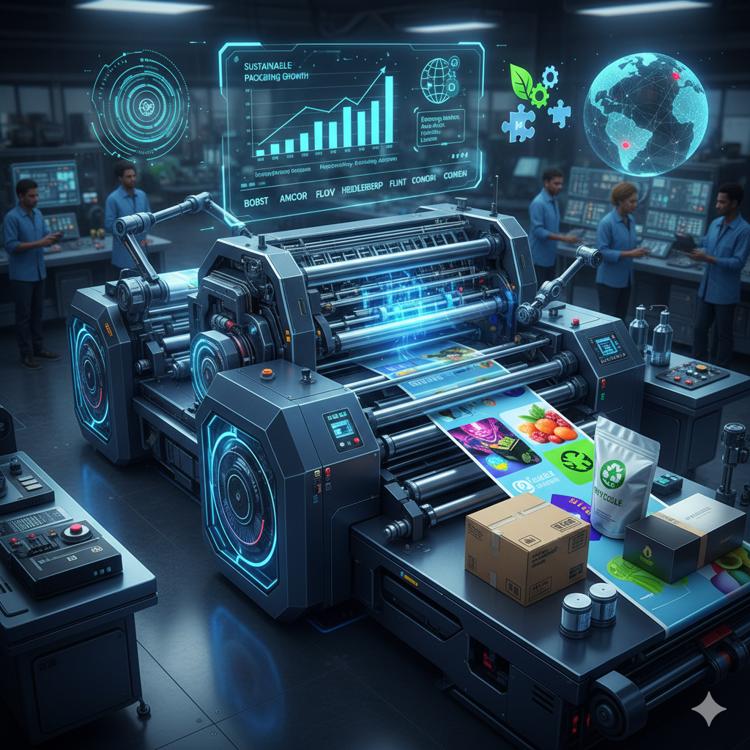 Key industry players, including Bobst, Amcor PLC, Heidelberger Druckmaschinen AG, and Flint Group, are actively shaping the market by focusing on advanced printing technologies, sustainable product offerings, and strategic investments to enhance global competitiveness in diverse packaging applications.
