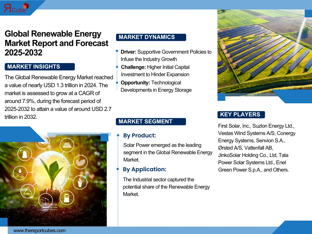 The Report Cube which is one of the leading market research company in UAE expects the Renewable Energy Market to grow at a CAGR of around 7.9% through 2032, as highlighted in their latest research report. The study provides an in-depth analysis of the emerging trends shaping the Renewable Energy Market and offers detailed forecasts for its potential growth during 2026–2032. The report also presents a comprehensive assessment of the competitive landscape, including profiles of leading players, their performance metrics, and recent strategic developments. Additionally, it explores the key market drivers, challenges, opportunities, and provides insights into historical and future revenue trends at the global, regional, and country levels.
