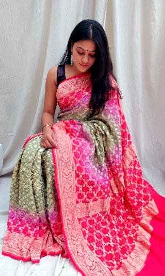 A Khaddi Georgette Saree is very versatile and will go with many occasions. When it comes to office and formal functions, one can opt for milder shades with less complex designs to have a professional touch. On formal occasions, darker shades with borders of gold will give a classy feel to the saree. Gulbhahar provides you with many shades to suit your need and your mood to choose your saree accordingly.